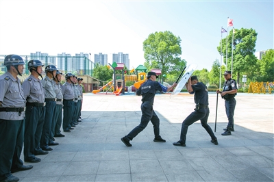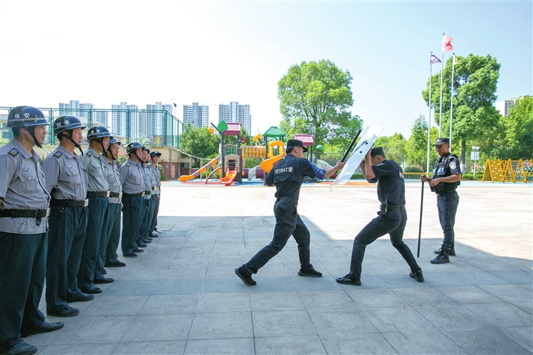 8月5日上午,南浔区公安分局联合区教育局、卫健委等部门在兰生宏达学校、宏达南浔幼儿园开展暑期校园安全演练。演练针对暑期校园安保的特点进行了实景模拟,南浔巡特警大队队员对参加培训的保安人员进行了面对面教学。