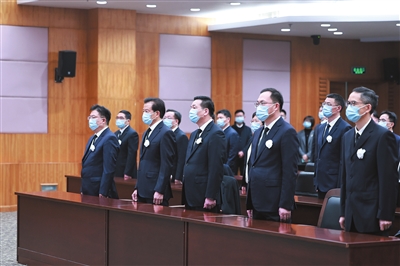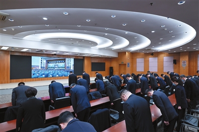 上午9时50分,市行政会议中心会场内,气氛庄严肃穆。陈浩、洪湖鹏等胸佩白花缓步来到会场,神情凝重地在会场肃立。10时整,江泽民同志追悼大会开始。在悲壮的哀乐声中,全体人员默哀3分钟,表达对江泽民同志的崇高敬意和深深哀思。在追悼大会中,大家认真聆听习近平总书记所致的悼词,深切缅怀江泽民同志的丰功伟绩和崇高风范。追悼大会结束时,大家悲痛肃立,向江泽民同志遗像深深三鞠躬。