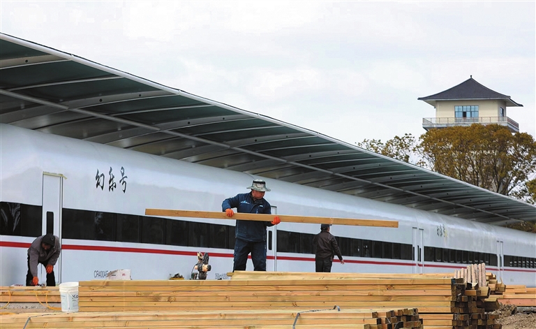 昨天,吴兴高新区幻溇村,工人们在修建景点休闲平台。近年来,该村依托小城镇综合环境整治,不断引入智慧农场、休闲栈道、咖啡餐饮等旅游项目,加强美丽乡村建设。