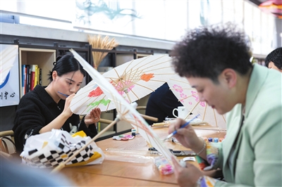 昨天,吴兴区爱山街道幸福邻里中心,居民正在彩绘油纸伞。当天,该幸福邻里中心开展“礼迎亚运”民俗体验活动,让居民感受传统文化魅力和亚运氛围。