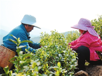 这两天,南太湖新区杨家埠街道西塞村的茶叶陆续进入采摘期,采茶工人们纷纷背起茶篓,走入茶树丛间,赶着春光采摘今年的首批春茶。