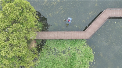 德清县下渚湖街道和睦村水下森林,村级河长日前正在打捞漂浮物。近年来,该街道通过立体式生态治理,让水体重获自净能力。