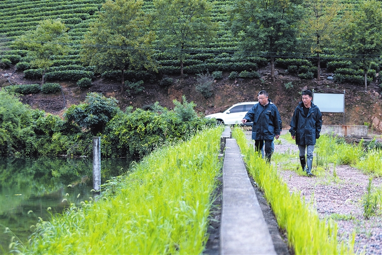 昨天,乡镇党员干部在长兴县和平镇回车岭村一地质灾害点巡查。连日来,我市多强对流天气,各级有关部门加强巡查力度,全面排查安全隐患点,保障群众安全。