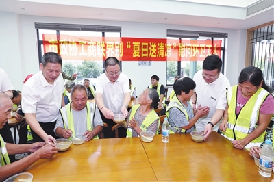 昨天,市政协工商联界别部分委员代表和市政协相关委室负责人前往湖州欣湖环保科技有限公司,为奋战一线的环卫工人赠送400余箱饮品和200余份夏令用品,给他们带去清凉和关心关爱。