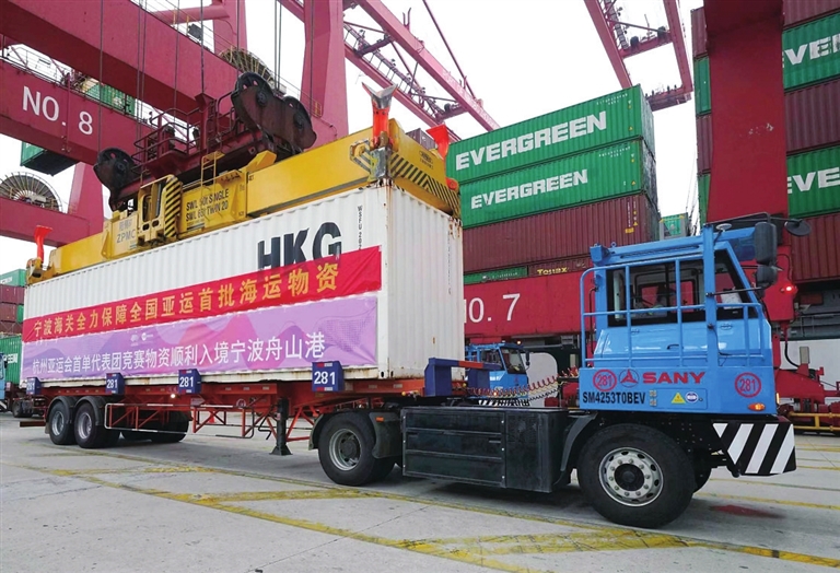 7月20日,集卡在宁波舟山港运输到港的中国香港代表团竞赛物资。当日,中国香港代表团首批参赛制服和竞赛物资分别从杭州萧山国际机场和宁波舟山港通关,这标志着杭州亚运会首批代表团物资通过海空两路运抵入境。