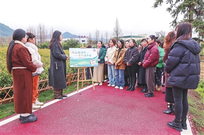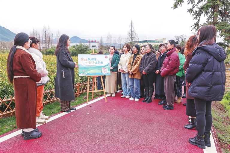 安吉县溪龙乡联合县妇联日前在该乡黄杜村举行“她力量·巾帼茶企助共富”活动。主办方邀请律师在茶园为茶农宣传宪法、民法典和涉茶知识产权法律等知识。