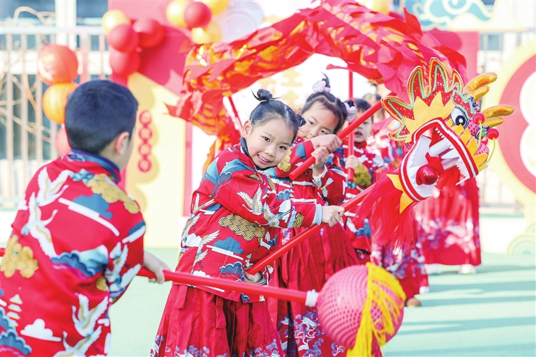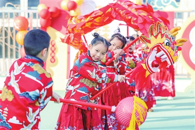 昨天,长兴县龙山街道中心幼儿园开展迎新活动,将传统民俗、特色美食、游乐节目融入活动中,孩子们学习舞龙舞狮、拓写福字、剪窗花等,增进对传统文化的认知,迎接新年的到来。