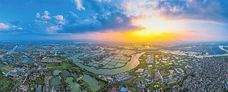 在南浔区和孚镇荻港村,千年桑基鱼塘近日沐浴在晚霞中,仿佛一幅美丽画卷。记者 吴拯 摄