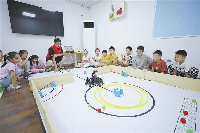 湖城湖东街道三里桥社区联合市青少年创客教育协会近日开展“暑期科创奇旅”,30名青少年在老师指导下体验积木机器人、水果电池等趣味科学实验,激发探索热情。记者 陆一平 摄