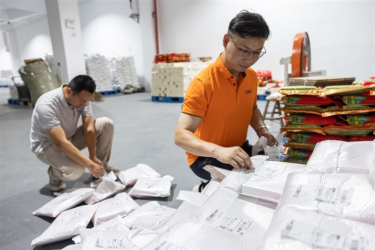 9月10日,邮政快递员在湖州振强粮食农民专业合作社进行上门揽收。连日来,湖州邮政公司为乡村电商企业提供上门揽收服务,畅通物流“最后一公里”。