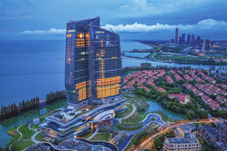 南太湖新区风帆酒店近日在夜幕下进行灯光调试。该酒店高164米,总投资约16亿元,目前外部装饰已经完成,预计今年四季度投用,将成为南太湖畔又一新地标。