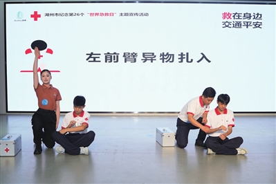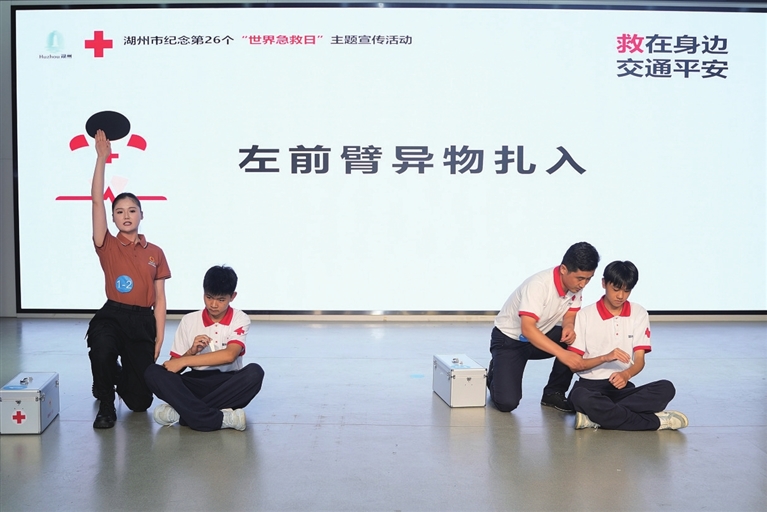 9月12日,在湖州交通技师学院,市红十字会联合市交通运输局、市总工会等部门和单位,共同举办湖州市纪念第26个“世界急救日”主题宣传活动暨“振兴阿祥杯”2025年湖州市红十字应急救护大赛。来自全市的7支代表队进行心肺复苏和AED使用等共7个科目的比赛。记者 张璐 摄