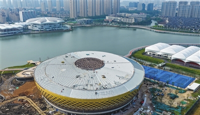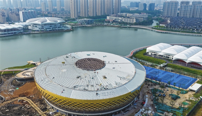 10月16日,吴兴区西湖漾奥青汇,工人们在奥青中心安装金属屋顶,预计今年12月竣工, 加上目前正在收尾的数字体育未来中心建设项目及已启用的网球中心,整个奥青汇为吴兴新青年城市建设增添了朝气、活力。