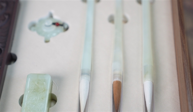 这套精制湖笔以珍贵岫岩玉为主要材质,完美兼具“尖、齐、圆、健”的湖笔四德,堪称湖笔中的佼佼者。笔头甄选上等山羊腋下毛,毛锋细腻柔韧,书写时聚锋回弹迅速;笔杆之上,工艺大师雕琢的精巧微雕雅致大气,将实用与艺术完美融合。这款国礼湖笔不仅尽显中华传统工艺的精湛,更生动彰显了“东亚文化之都”湖州深厚的文化底蕴与代代相传的匠心精神。