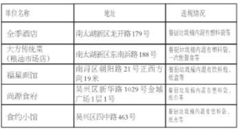 12月21日至12月27日实地检查中,南太湖新区公安局分局、诺亚舟春江名城幼儿园、九洲石锅鱼、湖州市南浔环境卫生管理所、吴兴状元楼分类意识好,餐厨垃圾分类投放正确,专用桶管理到位。全季酒店餐厨垃圾桶内混有塑料袋等。大方传统菜(粮油市场店)餐厨垃圾桶内混有塑料袋、一次性餐盒等。福星面馆餐厨垃圾桶内混有饮料瓶、纸盒等。尚源食府餐厨垃圾桶内混有塑料袋、纸巾等。食约小馆餐厨垃圾桶内混有塑料袋、纸盒等。