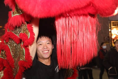 台上舞狮短短几分钟,虽值冬天,狮被里的刘超杰早已汗流浃背。