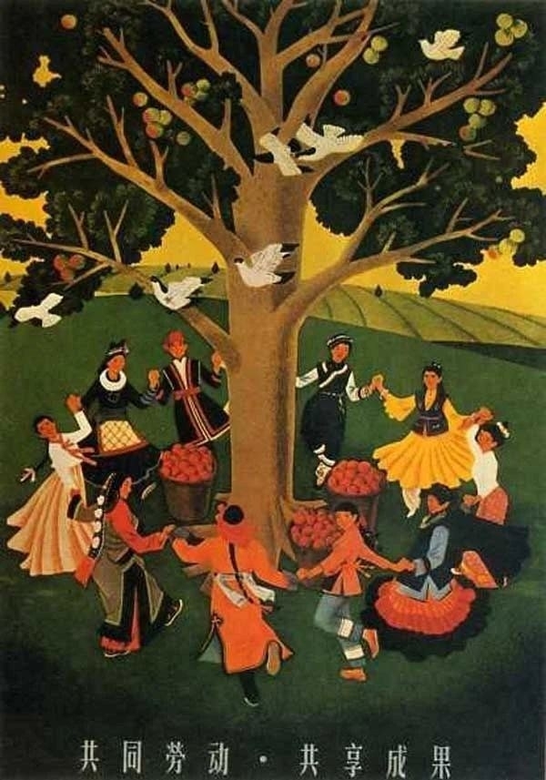 1957年,蔡振华的水粉画《共同劳动 共享成果》,在苏联莫斯科获“社会主义国家美展”优秀作品奖,并入藏中国美术馆。画作在深绿色的底子上,画了一群暖色调的各族群众,围着苹果树欢舞,共享劳动成果,这种色调的处理极为大胆,源自传统的推光漆器,又兼具苏东的国际范。蔡振华是艺坛多面手,工艺、广告、装帧、连环画、漫画、报花无所不能,其主要作品均由德清博物馆收藏。