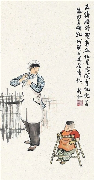 生活中有热闹场面也有静谧的角落。费新我1958年创作的水墨画《哺乳室》,就选取独特的角度来表现丝绸女工生产生活两不误的感人场景:“不停机杼理新丝,忙里偷闲看托儿。一日几回来哺乳,阿囡不再会啼饥。”费新我早年擅长人物画,作品多为紧随时代之作。