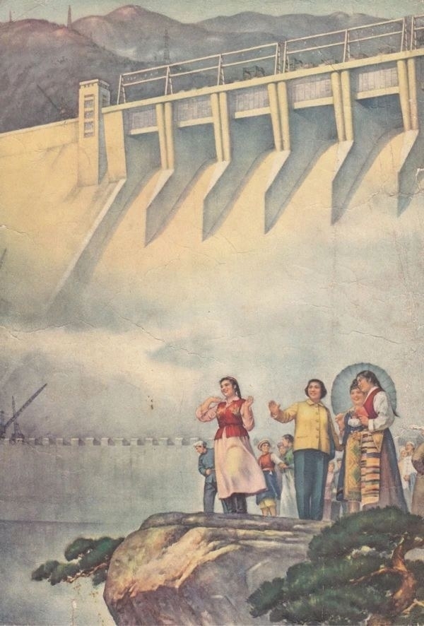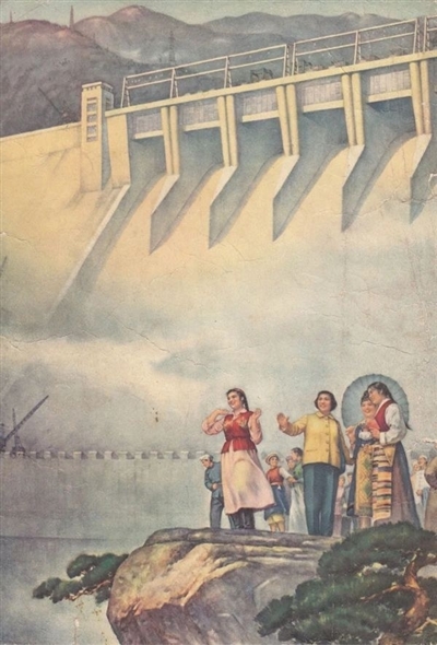1960年落成的新安江水电站,堪称新中国水利电力事业史上的一座丰碑,是集中力量办大事的范例,也是那个时期画家们热衷写生的范本。湖籍画家沈迈士、潘韵、费新我、赵延年等都从不同角度定格新安江水电站的雄姿。1964年上海青年画家庞卡从全国各族群众代表观光的角度,创作了年画《雄伟的新安江水电站》。家学渊源的庞卡20岁便进上海人民美术出版社任年画主创人员,其父庞亦鹏系湖州籍南浔人,是上海广告界大师级的人物。