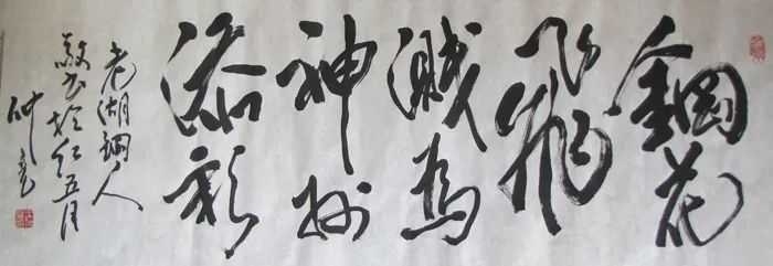 原湖州钢铁厂也曾是各路人才会聚之场所。就书画而言,有“美工漆匠”汪雨人,还有“秘书下放”的谭其蔚与“知青上调”的王仲尧等,他们都擅长书法并爱好书画收藏。从1979年开始,王仲尧走南闯北,在繁忙的公务之余,挤出时间到各地的博物馆、字画店观看默记名家真迹。王仲尧几十年如一日临池挥毫,目识心记,刻意揣摩,逐渐步入书法艺术的正轨。“钢花飞溅为神州添彩”是作为老湖钢人特为红五月提笔敬书。