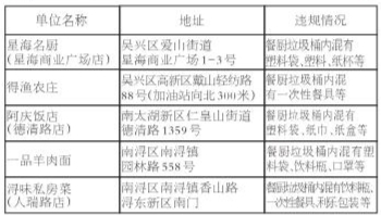 2022年8月9日至2022年8月15日实地检查中,浙江晶日科技股份有限公司、特色乌镇煲(天民商座店)、浙江南浔经济开发区管理委员会、全季酒店(湖州南浔店)、湖州吴兴绣江南餐厅分类意识好,餐厨垃圾分类投放正确,专用桶管理到位。星海名厨(星海商业广场店)餐厨垃圾桶内混有塑料袋、塑料、纸杯等,得渔农庄餐厨垃圾桶内混有一次性餐具等,阿庆饭店(德清路店)餐厨垃圾桶内混有塑料袋、纸巾、纸盒等,一品羊肉面餐厨垃圾桶内混有塑料袋、饮料瓶、口罩等,浔味私房菜(人瑞路店)餐厨垃圾桶内混有饮料瓶、一次性餐具、利乐包装等。