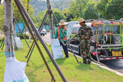 昨天,德清县武康街道舞阳街,园林工人正在给道路中央绿化带中的银杏树安装灌溉袋。该县园林绿化工作人员坚守岗位,科学安排浇水时间,对一些土壤结构较差的树木采用“挂袋滴水”,模拟滴灌效果,给植物提供源源不断的“止渴水”,确保植物安全度夏。