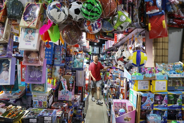 各种玩具在小店里堆成一座座小山。从指甲盖大小的挂件到一人高的玩偶,数量之多、品种之繁,令人眼花缭乱。