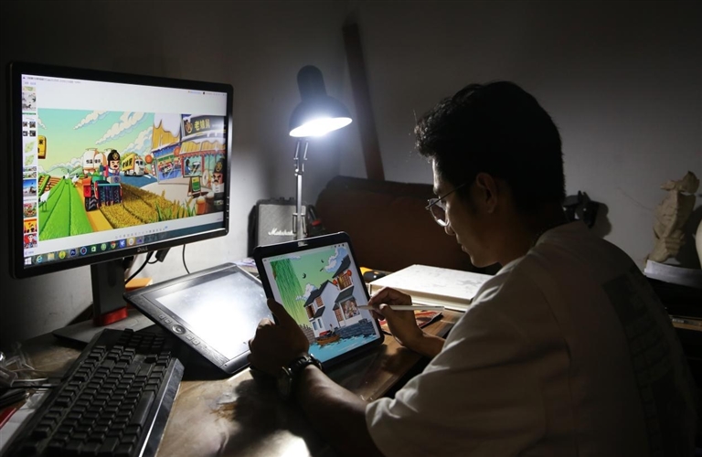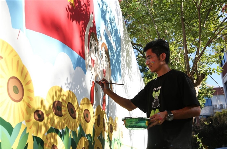 2014年,潘震兴和小伙伴一起创办了一家文化创意公司,主营墙绘、插画等业务。如今他从事墙绘艺术已有10个年头,工作范围扩大到了江浙沪地区。接单、设计效果图、定稿、进场创作……这是潘震兴的基本工作流程。“每次把一面白墙绘成五彩缤纷的图案,看到过往的人们驻足欣赏、拍照留念,我就很有成就感。”潘震兴说。