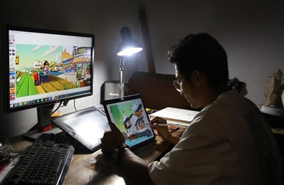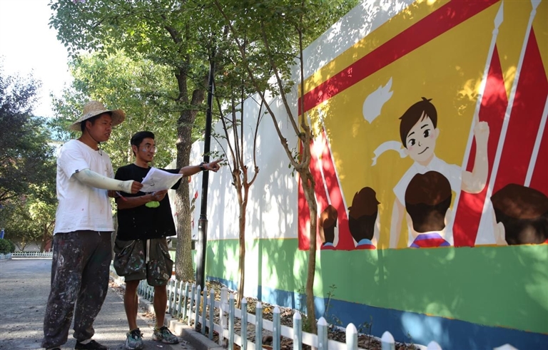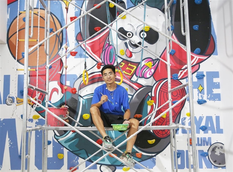 “做这工作累并快乐。”他笑着说。当接到一些商铺的墙绘订单,为了不影响开张,绘制时间紧张,他和小伙伴们便要通宵加班,面临体力和脑力劳动的双重考验。但潘震兴乐此不疲,从大街到小巷,从城市到乡村,商铺、酒吧、学校……都有他的作品。“哪里有活干就到哪里去,趁着年轻,多奋斗!”每年下半年是墙绘的旺季,有的工期两三天,有的工期大半个月,忙碌起来都没有休息时间。