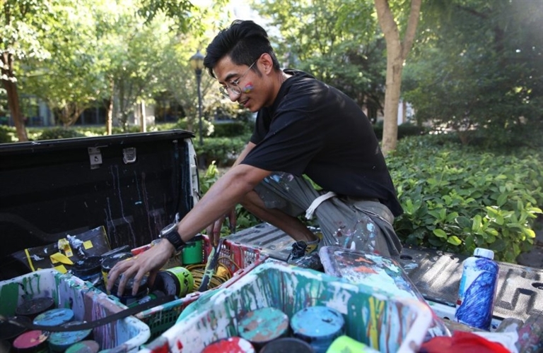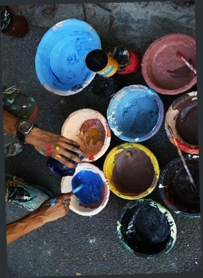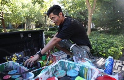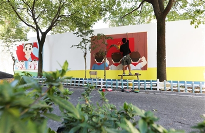 在很多人印象中,绘画是件很文艺且优雅的事,但墙绘师的工作远不如大家想象得那样轻松。因为长期从事户外工作,他的皮肤被晒得黝黑,衣裤、鞋子沾满各种颜料。特别是高温天,在户外持续工作几小时,有时还要高空作业,就很容易中暑。