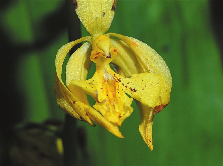 “这次发现的大黄花虾脊兰为1个居群共3株,其中2株处于开花状态,另1株较小,尚未开花。”据安吉县林业局自然资源保护中心副主任何莹介绍,大黄花虾脊兰是兰科常绿草本,叶片硕大,花序修长,花大且呈金黄色,如同一只只金色的小鸽子,生长在海拔300米至1500米的深山林中。其生境选择苛刻,野外自然结实率低,野生资源分布极少,被誉为“植物界的金丝猴”。目前国内仅存于江西、安徽、湖南等省的局部山区,被世界自然保护联盟(IUCN)红色保护名录列为极危(CR)等级,也是我国亟待保护的120种“极小种群野生植物”之一。